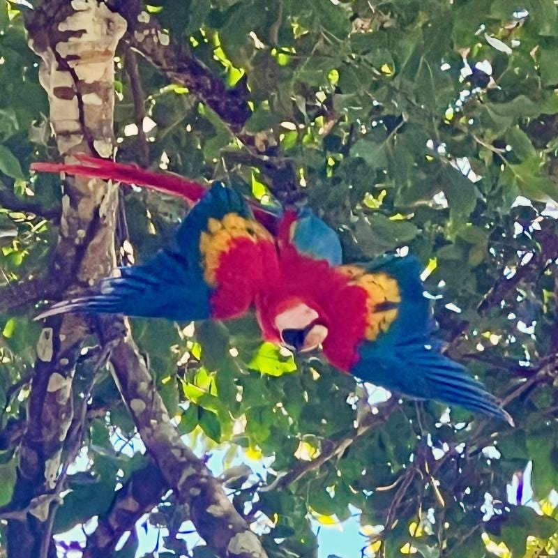 Ze krasten en spreiden hun vleugels terwijl ze zich zo ondersteboven hangend aan elkaar vergrepen. Prachtig! Wat een geluk! Ik filmde het geheel en begon me er zo na verloop van tijd een beetje ongemakkelijk bij te voelen, want hadden deze hysterisch gekleurde dieren niet ook recht op wat privacy tijdens de daad? Ik stopte mijn telefoon dus weer weg en draaide me om.