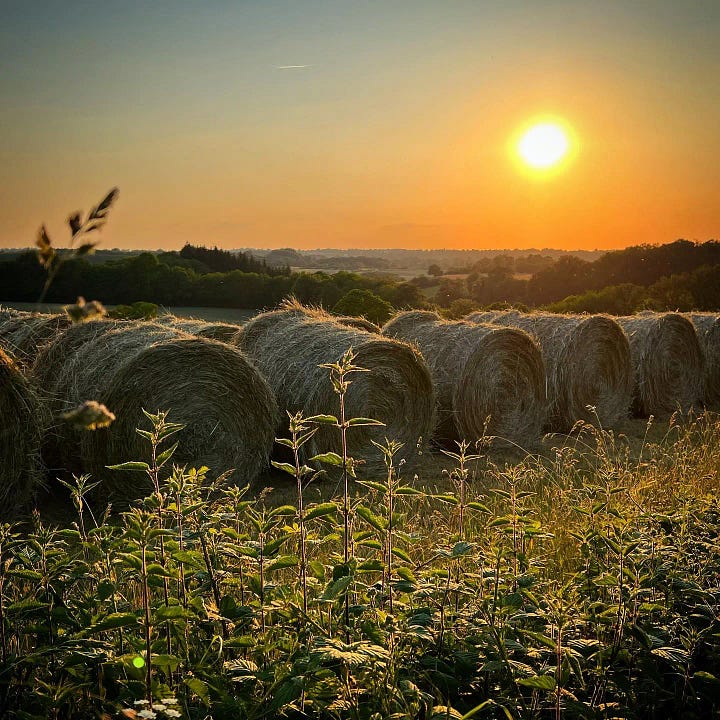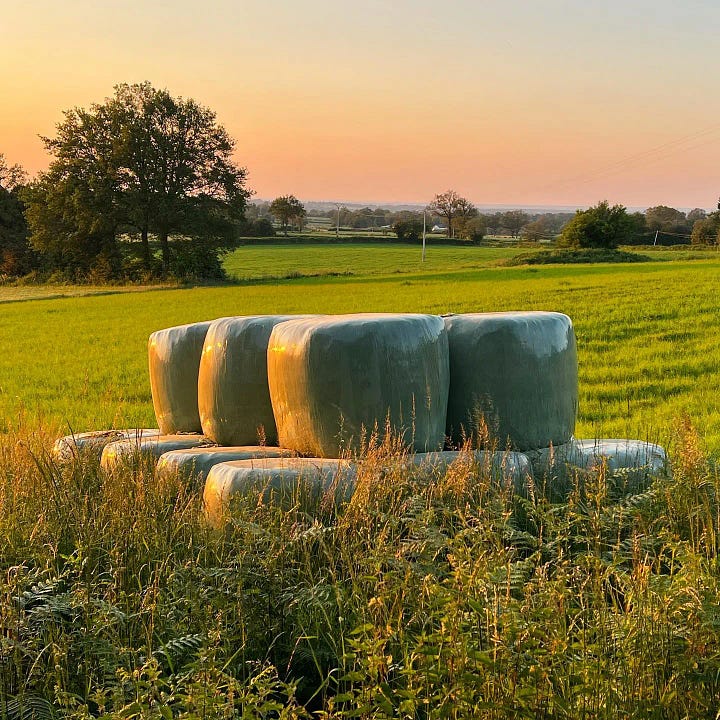 Zo rond deze tijd verheug ik me namelijk altijd op de opgerolde hooibalen die na een flinke maaibeurt kriskras op de kale weilanden achterblijven. De zon speelt met hun schaduwen terwijl ze liggen te drogen. Het aanzicht van die balen geeft me altijd het gevoel dat een eeuwenoude traditie wordt voortgezet. Eentje die vroeger werd vastgelegd door schilders en waar we nu een snel kiekje van kunnen schieten, om te bewijzen dat veel verloren is gegaan, maar dát gelukkig niet.
