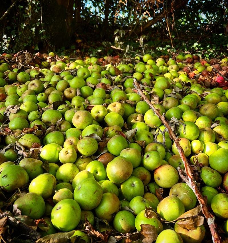 Ineens stuitte ik op een tafereel dat niet in de haak kon zijn. Want welke gek dumpt een hele appeloogst onder een boom? Ik ben opgevoed met het mantra ‘Eet jij nog even dat laatste restje op? Anders is het zonde.’ Dus deze scene voelde als een misdaad.