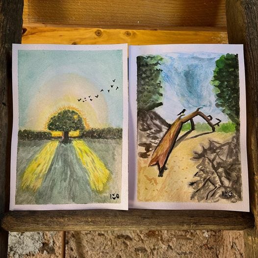 Omdat je je creatieve drang moet volgen zijn er nu de eerste voorzichtige aquarels bijkomen van taferelen die ik op mijn wandelingen tegenkom en waarvan een foto de werkelijkheid niet naar behoren dekt.