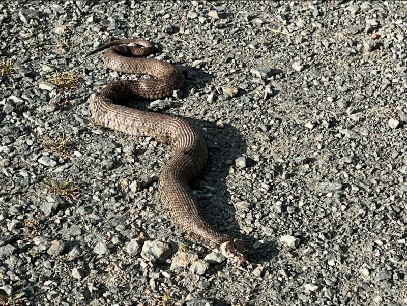 Zo kwam het dat ik nabij m’n schrijvershuisje een brug over een slingerriviertje vond, dat naar een lang pad tussen weilanden door leidde. Hooibalen op links, bloeiende zonnebloemen op rechts, wildgroei van stekelige bramentakken boven en her en der schichtige koeien voor de afwisseling. Mec liep voor me uit en had totaal geen oog voor een enorme slang die roerloos midden op dat pad lag. Hij was dik en opgezet en ik vroeg me af of hij dood was of een of andere muizenfamilie lag te verteren en geen zin had om dekking te zoeken. Hoe dan ook was doorlopen het verstandigst.