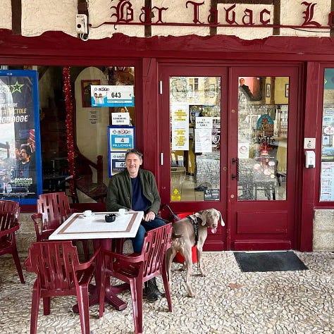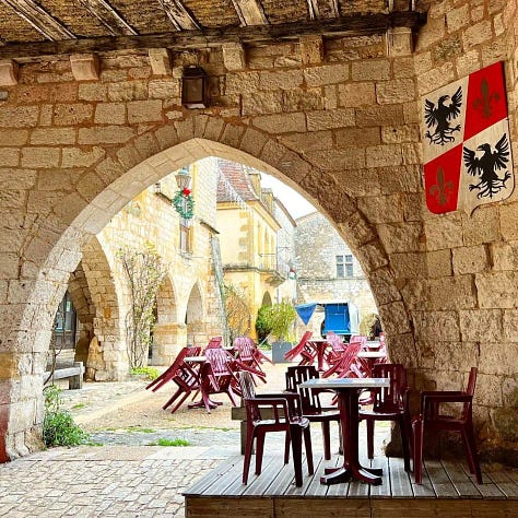 ‘Hey’, zei ik, terwijl ik naar een aanplakbiljet wees. ‘Ze hebben hier op mijn verjaardag glühwein en er is iets van een kerstmarkt. Leuk, kunnen we daar naartoe.’ We zaten bij het café op de hoek van het marktplein in Monpazier, een prachtig stadje in de Dordogne. F heeft er fijne herinneringen aan van dertig jaar geleden, toen hij hier met zijn zus verbleef. Hij wilde terug naar de plek die zo vaak voorbij was gekomen in verhalen over toen. Voor mijn verjaardag boekte hij als verrassing een airbnb en gisteren togen we naar het zuiden om er samen even uit te zijn en zodat ik eindelijk beeld bij het woord zou krijgen.