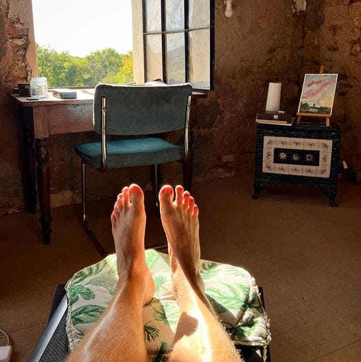 Mensen die schrijven, zitten en God wat zit ik graag. Het liefst in een half liggende houding, zo’n houding waar een chaise longue voor is uitgevonden, of een bed. Ik heb er ook een gevleugelde uitspraak voor: ‘Hè hè’. Mijn moeder schiet altijd weer in de lach als ik na een reis van acht uur of een ommetje van vijf minuten op de bank plaatsneem en die allesomvattende klanken vanuit het diepste van mijn ziel, langgerekt en ook een beetje opgelucht uitspreek.